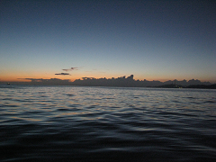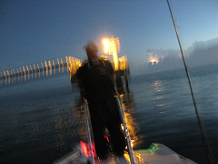 ボートから見る志布志湾は、海岸線が防風林とサーフで構成され、チョチョッと港湾地帯に明かりがともって空は満点の星空。
