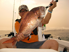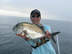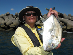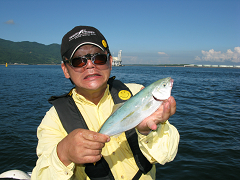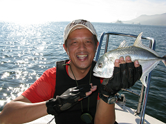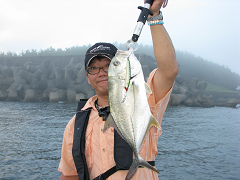 その後、朝マズメに鯛狙いに彷徨ったが、40cm級のマアジが5ヒット2ゲットで終了。