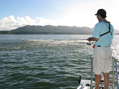 レインウェアー持参のもっさんは、バウに立ってキャストできるが、何故かレインウェアーを持ってきてない私は、雨が強くなるたびに愛艇HHのビミニトップ(折りたたみ式の屋根)を広げては、天気待ち。