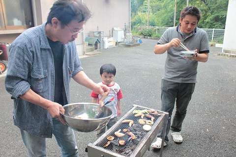 菊池米のおにぎりに、何故かB.B.Q.に合う味噌汁でお腹を満たす。